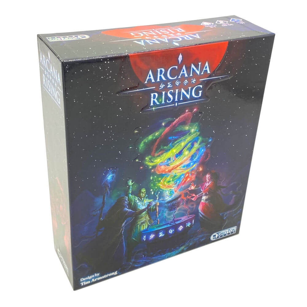 Arcana Rising ist ein Drafting- und Engine-Building-Spiel, bei dem die Spieler*innen in drei Runden darum wetteifern, eine magische Engine zu bauen, die ihre gesammelten Artefakte mit Energie versorgt und ihnen am Ende des Spiels Punkte einbringt.