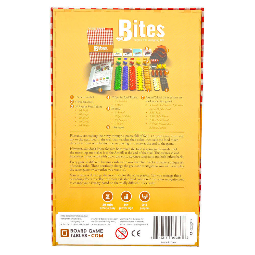 Fünf Ameisen suchen sich einen Weg durch leckere Nahrung. Wenn du an der Reihe bist, bewegst du eine der Ameisen auf die nächste Nahrung, die mit der Farbe der Ameise übereinstimmt. Du bekommst den Futter-Marker, der direkt vor oder nach der Ameise und darfst diesen bis zum Ende des Spiels behalten.