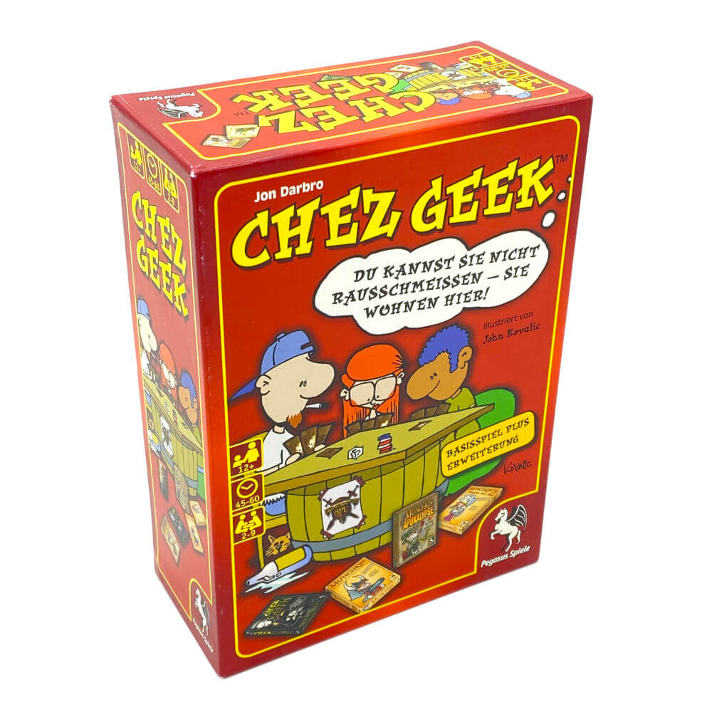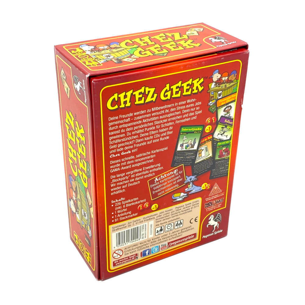In Chez Geek werden du und deine Freunde Wohnungsgenossen – ihr wohnt zusammen in einer WG, und zwar so lange, wie ihr euch gegenseitig ertragen könnt. Bei Chez Geek geht es darum, als erster ganz entspannt zu sein – das erreichst du durch Aktivitäten wie beispielsweise Schlafen, durch Shoppen, indem du dir unverzichtbare Dinge wie Essen, Alkohol oder Gras kaufst, oder durch die richtigen Personen, die dich besuchen kommen. Durch das Ausspielen der entsprechenden Karten bekommst du Slackpunkte, quasi deine persönliche Dosis Glück.