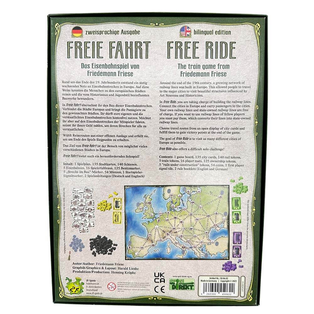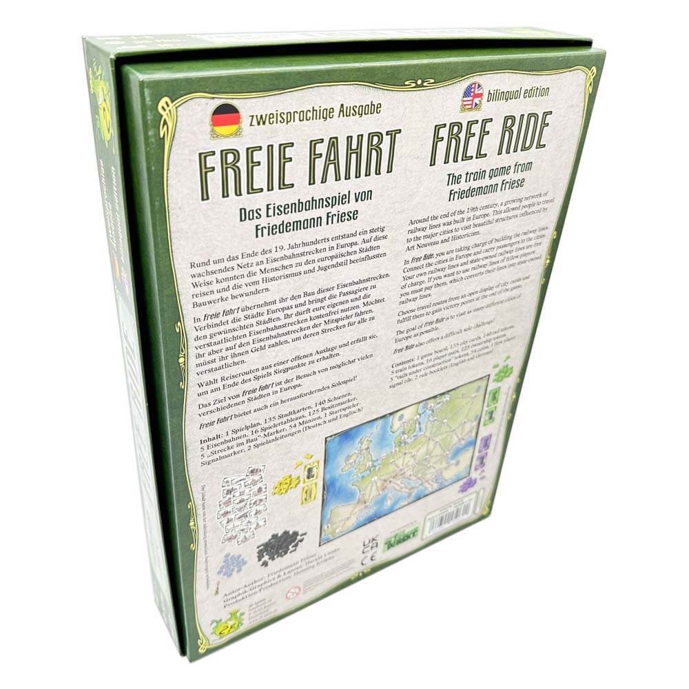 In Freie Fahrt übernehmt ihr den Bau dieser Eisenbahnstrecken. Verbindet die Städte Europas und bringt die Passagiere zu den gewünschten Städten. Ihr dürft eure eigenen und die verstaatlichten Eisenbahnstrecken kostenfrei nutzen. Möchtet ihr aber auf den Eisenbahnstrecken der Mitspieler*innen fahren, müsst ihr ihnen Geld zahlen, um deren Strecken für alle zu verstaatlichen.