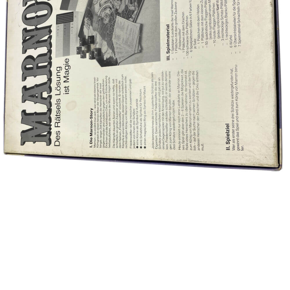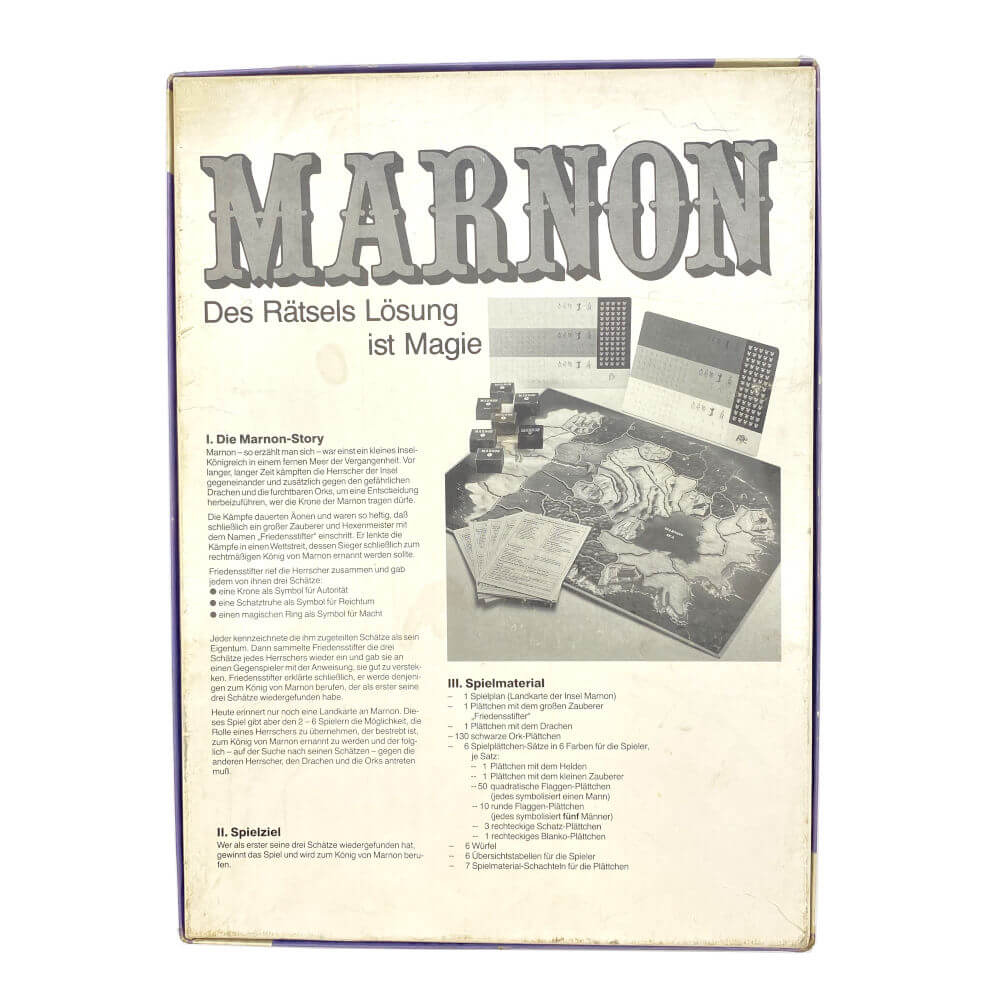 Heute erinnert nur noch eine Landkarte an Marnon. Dieses Spiel gibt aber den 2 bis 6 Spielern die Möglichkeit, die Rolle eines Herrschers zu übernehmen, der bestrebt ist, zum König von Marnon ernannt zu werden und der folglich – auf der Suche nach seinen Schätzen – gegen die anderen Herrscher, den Drachen und die Orks antreten muss.