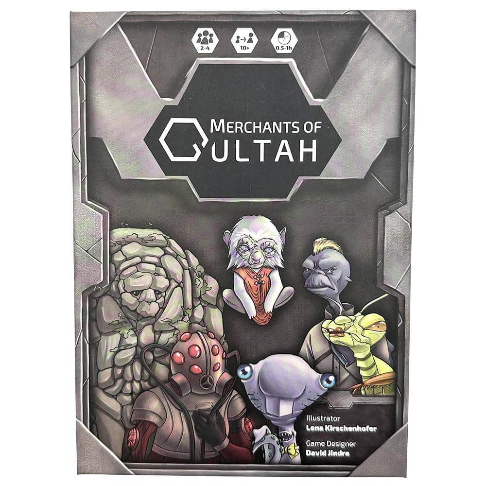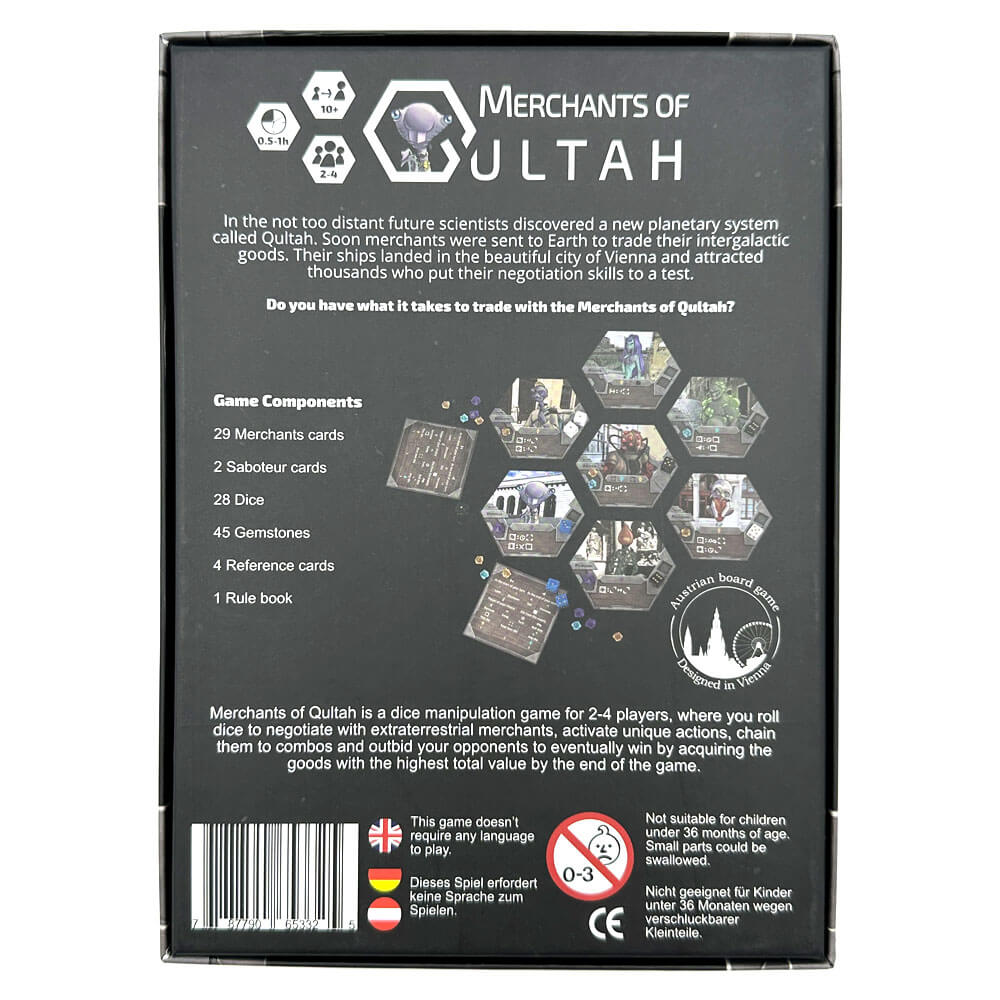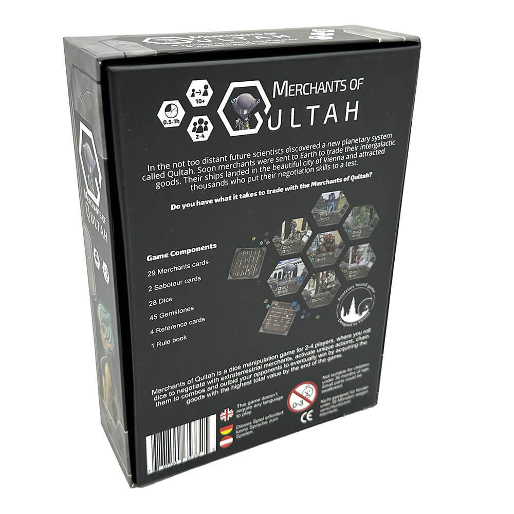 Ein Spiel Merchants of Qultah läuft über zwei Runden, jede davon repräsentiert einen Tag auf der Erde. Die Spieler*innen versuchen mit den außerirdischen Händlern zu verhandeln und zeitgleich die Verhandlungen ihrer Mitspieler*innen zu manipulieren.