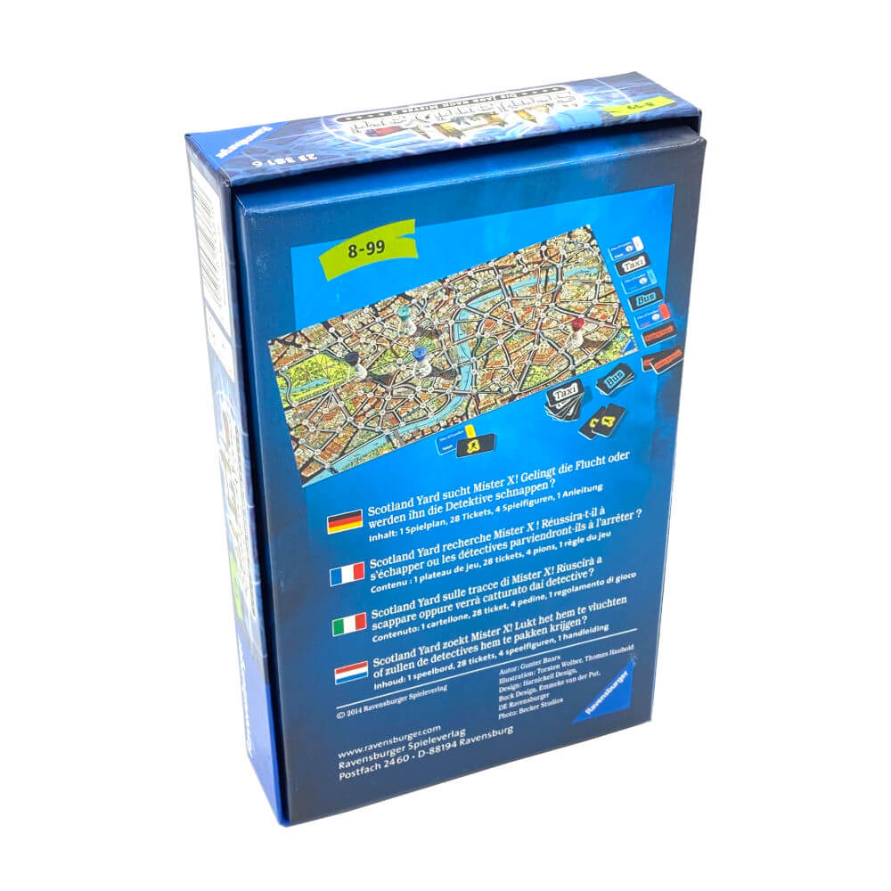 Mister X flieht durch London und darf sich nicht von den Detektiven schnappen lassen! Je länger Mister X entwischen kann, desto mehr wertvolle Punkte sammelt er.