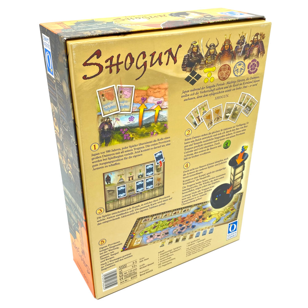 Übernimm in Shogun die Rolle eines großen Daimyos mit all seinen Truppen in Japan vor zirka 500 Jahren. Die ersten Provinzen werden bei Spielbeginn verteilt. Sichere dir eine gute Ausgangsposition für deine Armeen. Jeder hat die gleichen 10 Aktionen zu Verfügung. Du kannst dein Reich entwickeln, Burgen und Tempel bauen oder deine Truppen einsetzen und Getreide und Geld einziehen von deinen Provinzen.