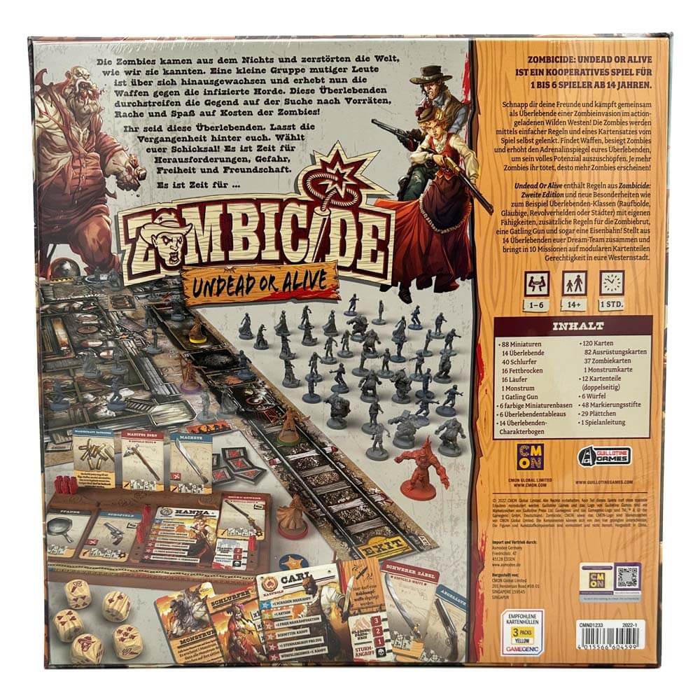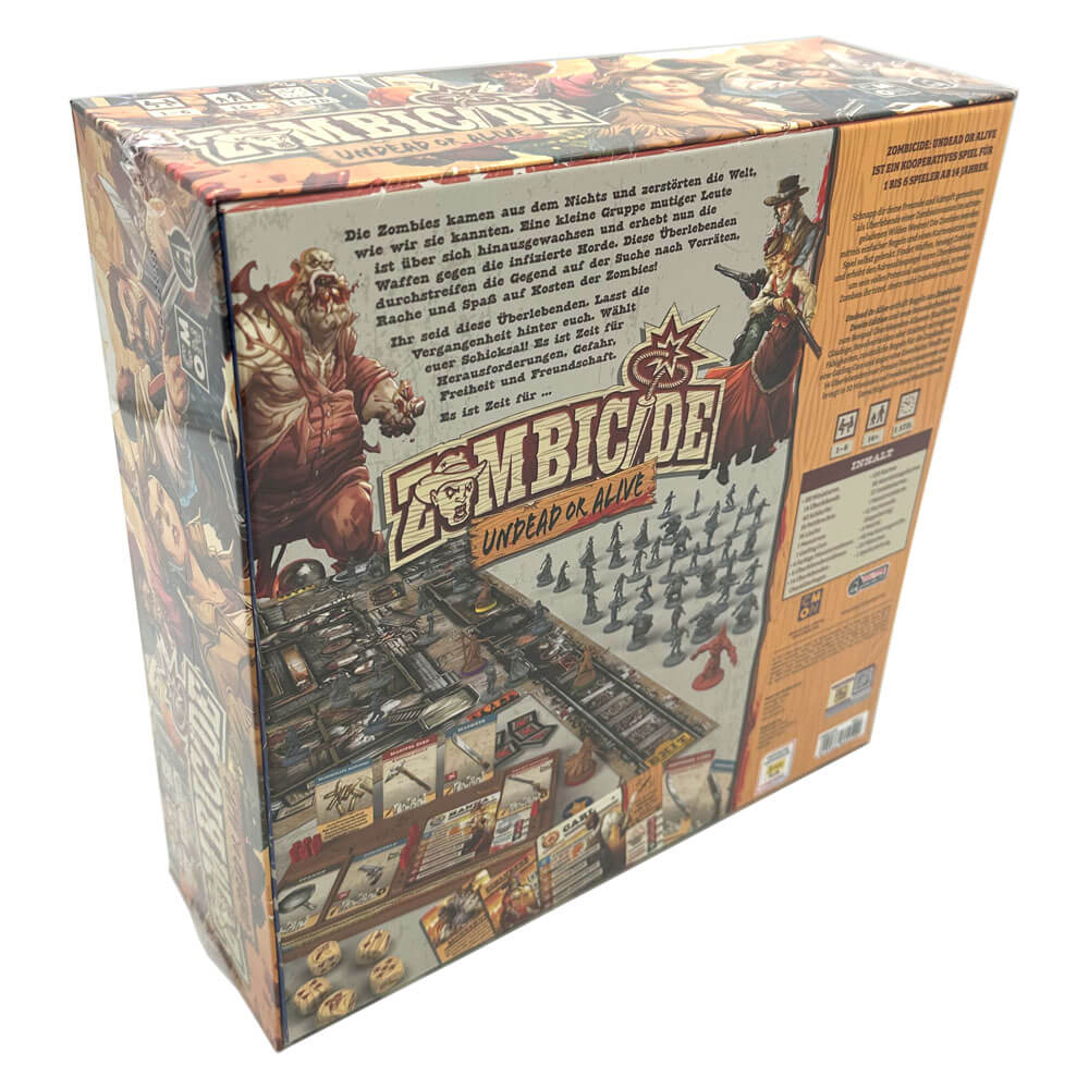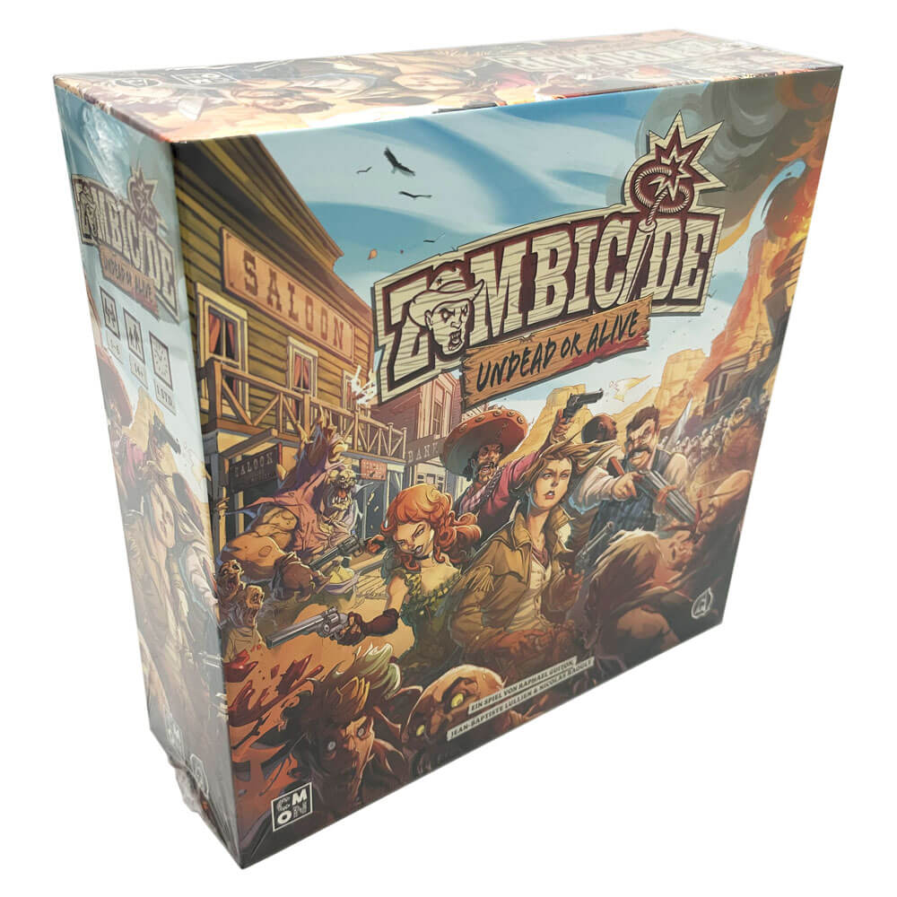 Zombicide Undead or Alive ist ein kooperatives Spiel für ein bis sechs Spieler*innen ab 14 Jahren. Als Überlebende einer Zombieinvasion kämpfen die Spieler*innen im actiongeladenen Wilden Westen gemeinsam gegen die infizierte Horde. Das Spiel enthält Regeln aus Zombicide: Zweite Edition und neue Besonderheiten wie zum Beispiel Überlebenden-Klassen (Raufbolde, Gläubige, Revolverhelden oder Städter) mit eigenen Fähigkeiten, zusätzliche Regeln für die Zombiebrut, eine Gatling Gun und sogar eine Eisenbahn!